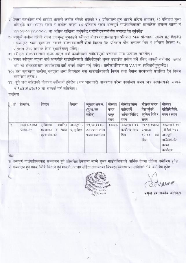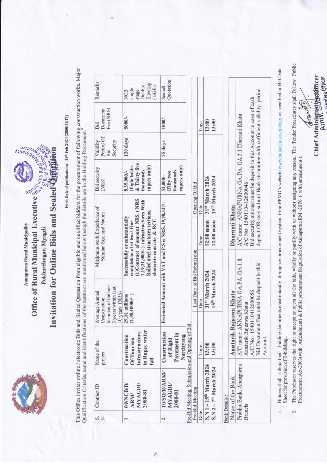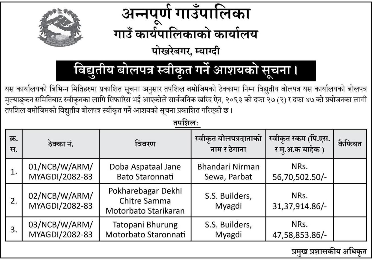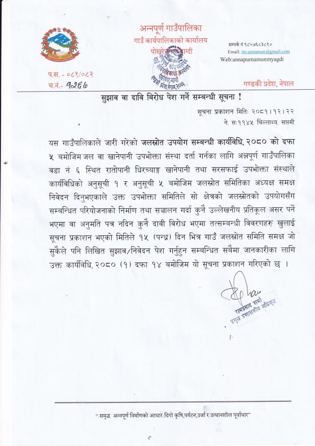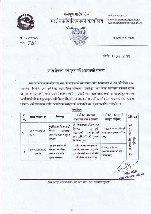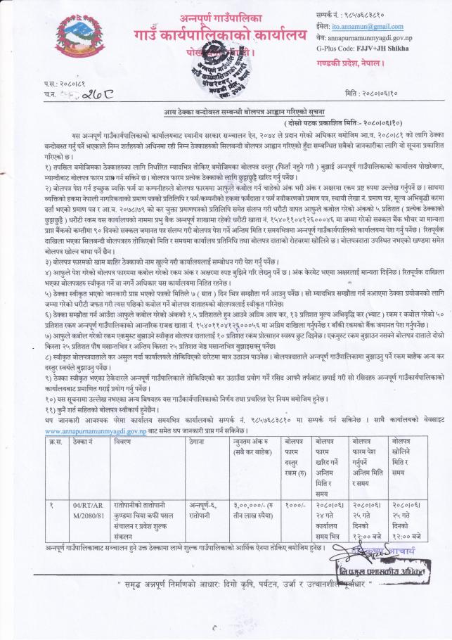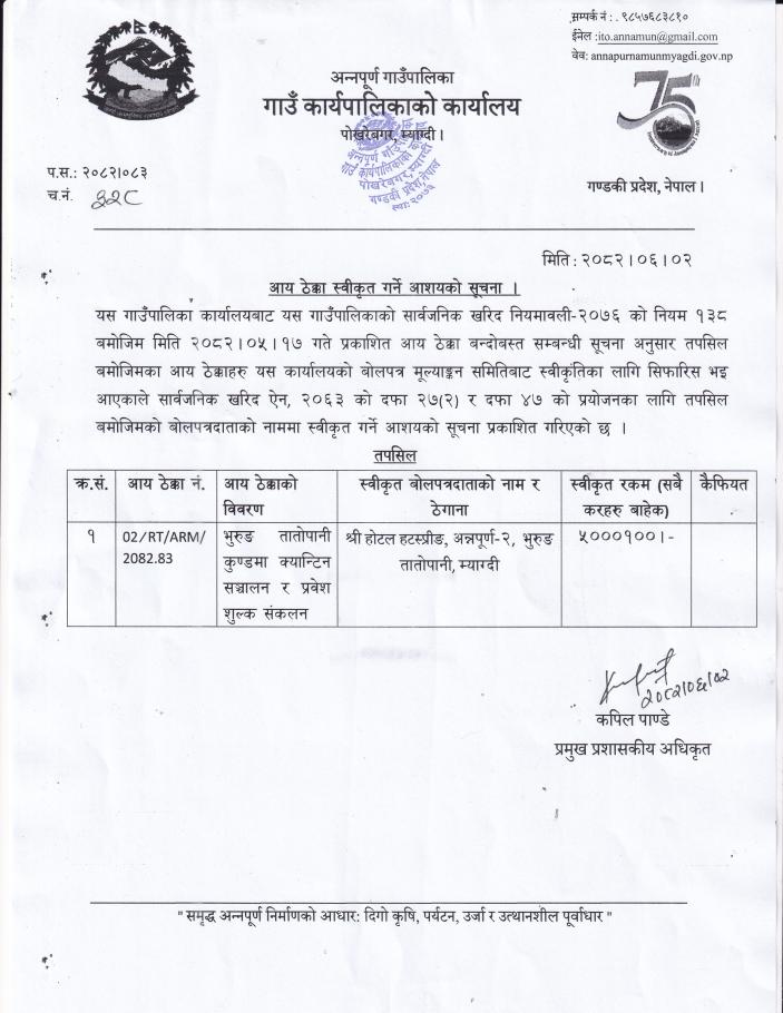 अन्नपूर्ण गाउँपालिका सार्वजनिक-निजी साझेदारी सम्बन्धी ऐन, २०७६ को दफा १७ बमोजिम प्राकृतिक तातोपानी पाउद्वार कुण्डलाई व्यवस्थित बनाउनका लागि डिजाइन, निर्माण सञ्चालन र हस्तान्तरण गर्ने विधि मार्फत सार्वजनिक निजी साझेदारीमा सञ्चालनको लागि