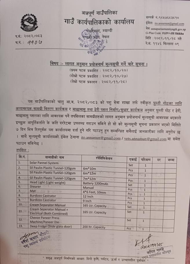 » लागत अनुमान प्रयोजनार्थ मुल्यसूची पेश गर्नेे बारे सूचना। (तेस्रो पटक)