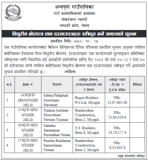 विद्युतीय दरभाउपत्रहरु स्वीकृत गर्ने आशयको सूचना। Ghatte Dada Motorbato Staronnati, Sarwodaya Ma. Vi. Bhawan Marmat, Bhurung Tatopani Swasthya Chuki Bywasthapan.