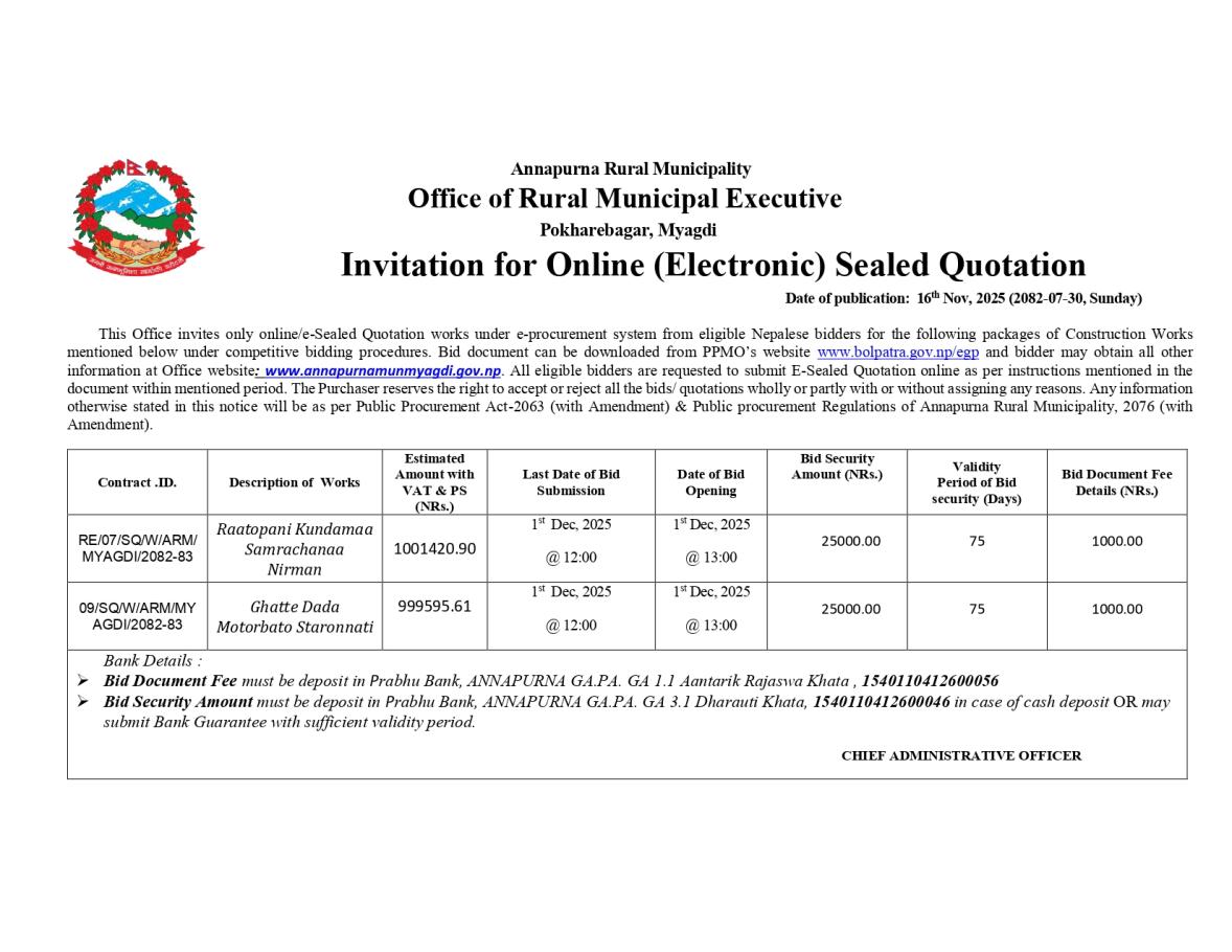 Invitation for Online (Electronic) Sealed Quotation Ratopani Kundama Samrachana nirman